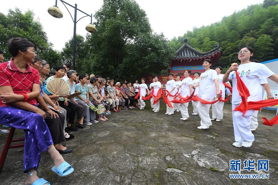 7月28日,在湖州吴兴区埭溪镇盛家坞村,埭溪成校志愿者团队用快板给村民说“垃圾分类”。 近年来,浙江省湖州市在“两山”理念指导下探索适合乡村特点的垃圾分类长效机制,在青山绿水间践行现代文明理念和绿色生活方式,建设生态宜居的美丽乡村。